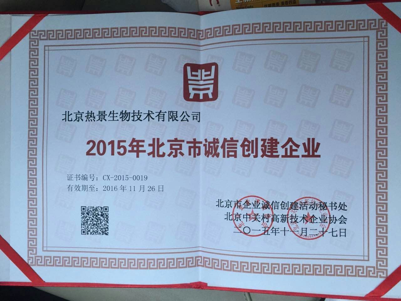 【榮譽】熱景生物榮獲2015年北京市誠信創(chuàng)建企業(yè)獎