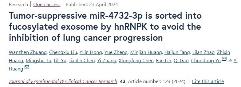 4月23日,福建醫(yī)科大學研究團隊在期刊《Journal of Experimental & Clinical Cancer Research》上發(fā)表了題為“Tumor-suppressive miR-4732-3p is sorted into fucosylated exosome by hnRNPK to avoid the inhibition of lung cancer progression”的研究論文,本研究為非小細胞肺癌提供了一個有前景的生物標志物,并通過靶向hnRNPK阻止miR-4732-3p從非小細胞肺癌細胞中“外泌體逃逸”,為非小細胞肺癌治療開辟了一條新的途徑。文章共同作者包括北京熱景生物技術股份有限公司高琦博士、劉城秀博士,熱景生物作為合作單位為研究的實施提供了重要支持。
