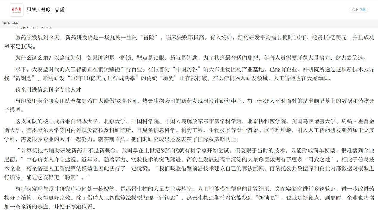 近期,人民日?qǐng)?bào)、新華社、經(jīng)濟(jì)日?qǐng)?bào)、中國(guó)外文局、北京日?qǐng)?bào)等多家媒體先后走訪熱景生物,通過(guò)報(bào)道國(guó)際先進(jìn)創(chuàng)新抗體藥物研發(fā)前行者——舜景醫(yī)藥、X-Gen AI新藥發(fā)現(xiàn)與設(shè)計(jì)研究中心最新研發(fā)管線進(jìn)展、學(xué)術(shù)成果等實(shí)踐案例,進(jìn)一步揭開AI加速FIC抗體藥物研發(fā)神秘面紗,探索人工智能技術(shù)如何打破藥物研發(fā)“雙十定律”。