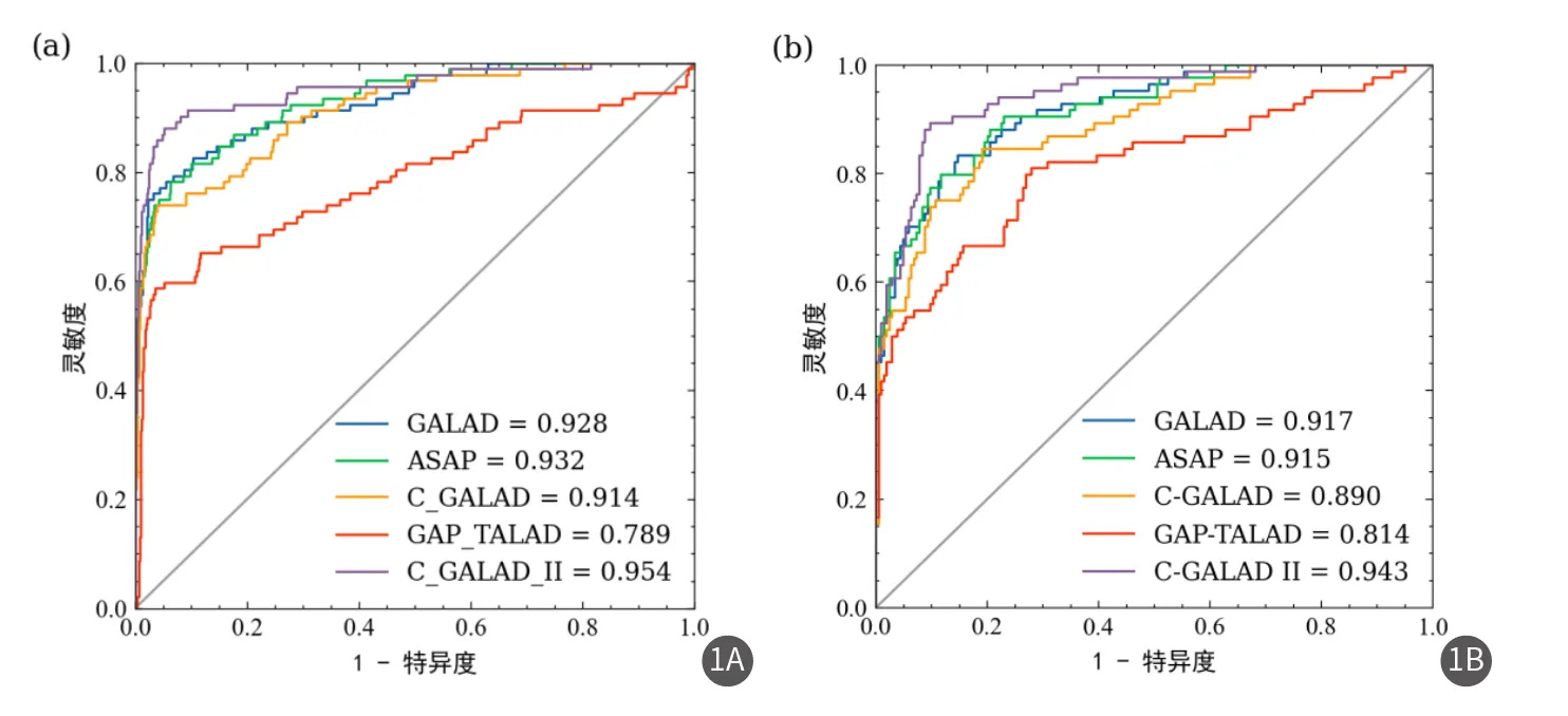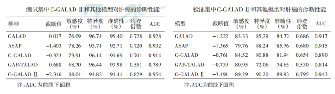 在測試集上驗證C-GALAD Ⅱ所得AUC為 0.954,敏感度為88.04%,特異度為94.85%;在外部獨(dú)立驗證集的C-GALAD Ⅱ所得AUC為0.943,敏感度為89.29%,特異度為90.2%,性能優(yōu)于其他已發(fā)表模型。