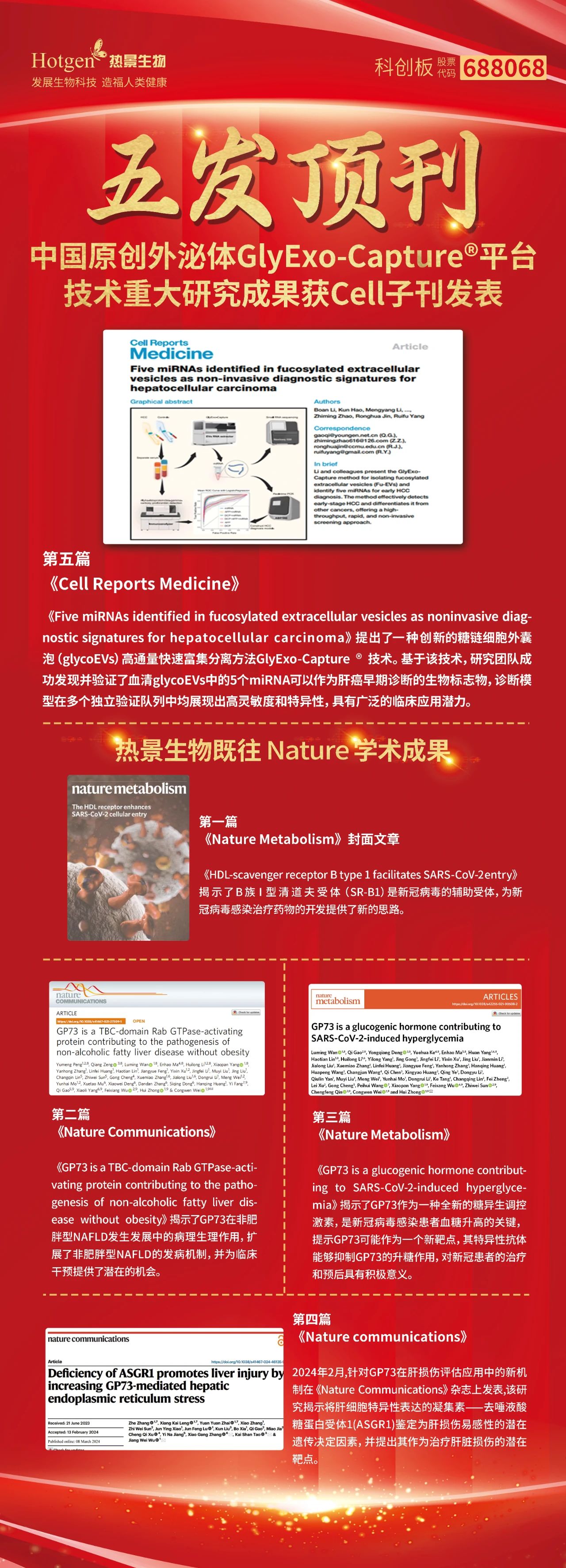 GIyExo-Capture?平臺(tái)是中國(guó)IVD科研創(chuàng)新創(chuàng)造的一個(gè)典范,針對(duì)全球范圍內(nèi)外泌體液體活檢應(yīng)用準(zhǔn)確率不高,操作繁瑣等臨床應(yīng)用挑戰(zhàn),提供了創(chuàng)新的解決方案。該平臺(tái)采用糖捕獲技術(shù),實(shí)現(xiàn)疾病相關(guān)外泌體全自動(dòng)、快速高通量分離,以及外泌體運(yùn)載microRNA的高靈敏度檢測(cè)。目前,熱景生物具有自主專利GIyExo-Capture?平臺(tái)開發(fā)的系列癌癥早期診斷成果陸續(xù)通過注冊(cè)檢驗(yàn)(胰腺癌、肝癌、胃癌等),相關(guān)神經(jīng)退行性疾病研發(fā)項(xiàng)目進(jìn)展順利。作為糖捕獲診斷方法學(xué)的提出者,熱景生物致力于將中國(guó)企業(yè)的原創(chuàng)性技術(shù)推廣應(yīng)用到全球臨床,為全球患者帶來更精準(zhǔn)、更便捷的診斷方案、使更多患者獲益于中國(guó)創(chuàng)新技術(shù)。