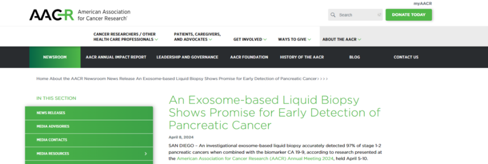 根據(jù)2024美國癌癥研究協(xié)會(AACR)年會上發(fā)表的一項(xiàng)研究,在結(jié)合生物標(biāo)志物CA 19-9的情況下,基于外泌體的液體活檢可準(zhǔn)確檢測出97%的Ⅰ~Ⅱ期胰腺癌。