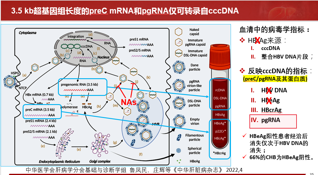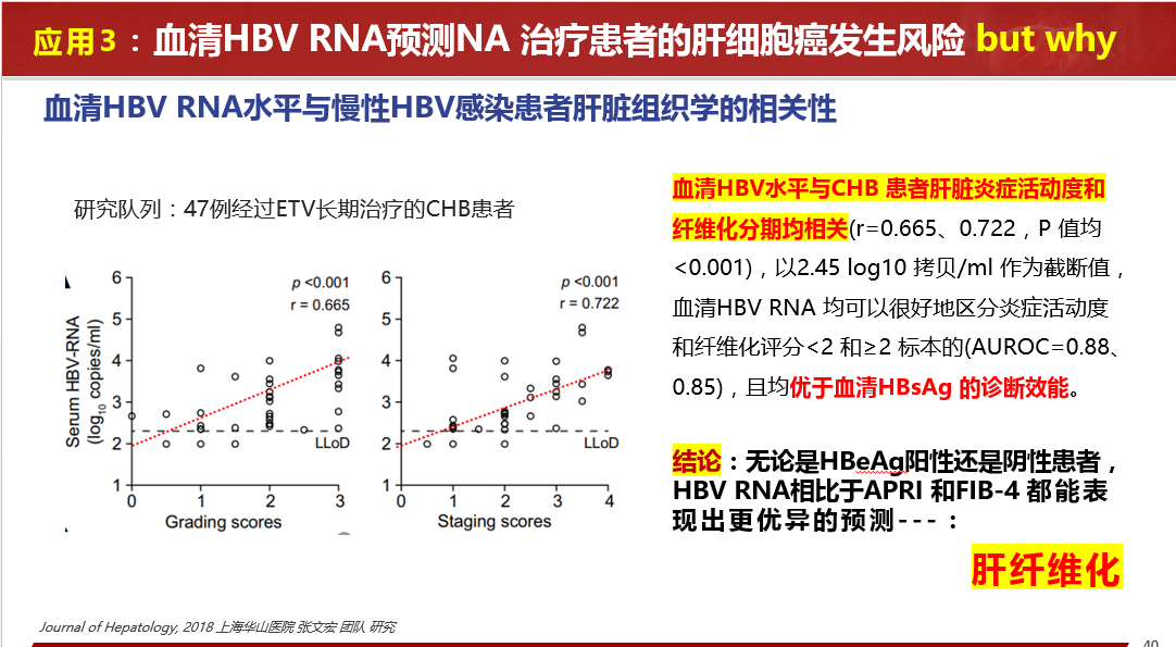 關(guān)于HBV RBA病毒樣顆粒的發(fā)現(xiàn)、血清HBV RNA的產(chǎn)生路徑、存在形式、來源和特點(diǎn)等做了詳細(xì)闡述,同時(shí)分享國內(nèi)肝病領(lǐng)域張文宏研究團(tuán)隊(duì)等工作成果,血清HBV RNA水平反映肝內(nèi)cccDNA的轉(zhuǎn)錄活性,血清 HBV pgRNA,是NA治療下HBV DNA < LLOQ后,能夠反映患者肝組織內(nèi)是否有cccDNA活躍轉(zhuǎn)錄的唯一指標(biāo)。