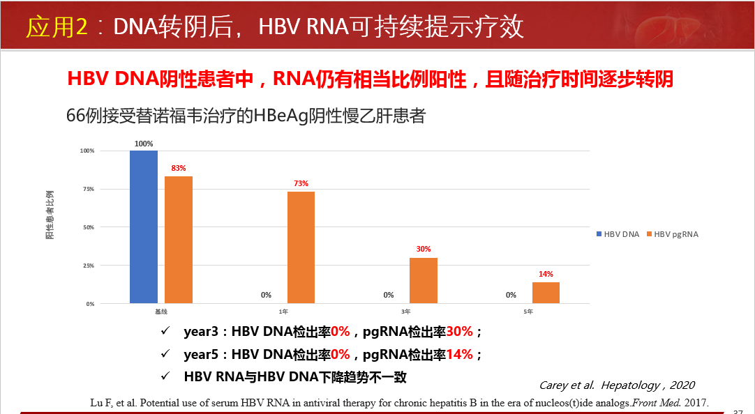 臨床應(yīng)用方面:指導(dǎo)安全停藥;NA治療下患者血清HBV RNA檢測陽性預(yù)示更高的HCC發(fā)生風(fēng)險(xiǎn);NA治療下患者血清HBV RNA檢測陽性,提示病毒cccDNA仍在有效轉(zhuǎn)錄表達(dá)病毒蛋白、組裝子代病毒顆粒樣pgRNA病毒顆粒。