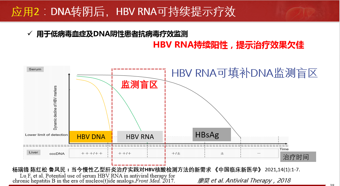 ★ 用于低病毒血癥及DNA陰性患者抗病毒療效監(jiān)測;HBV RNA可填補(bǔ)HBV DNA監(jiān)測盲區(qū),HBV DNA轉(zhuǎn)陰后可持續(xù)提示療效,HBV RNA持續(xù)陽性,提示治療效果欠佳。