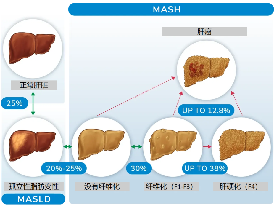 MASLD疾病譜包括單純性脂肪肝(MAFL)、脂肪性肝炎(MASH)及其相關纖維化和肝硬化。隨著肥胖和2型糖尿?。═2DM)的流行,全球MASLD患病率和發(fā)病率不斷增高。據報道,全球MASLD的發(fā)病率約20-35%,其中約10-30%的患者患有MASH。
