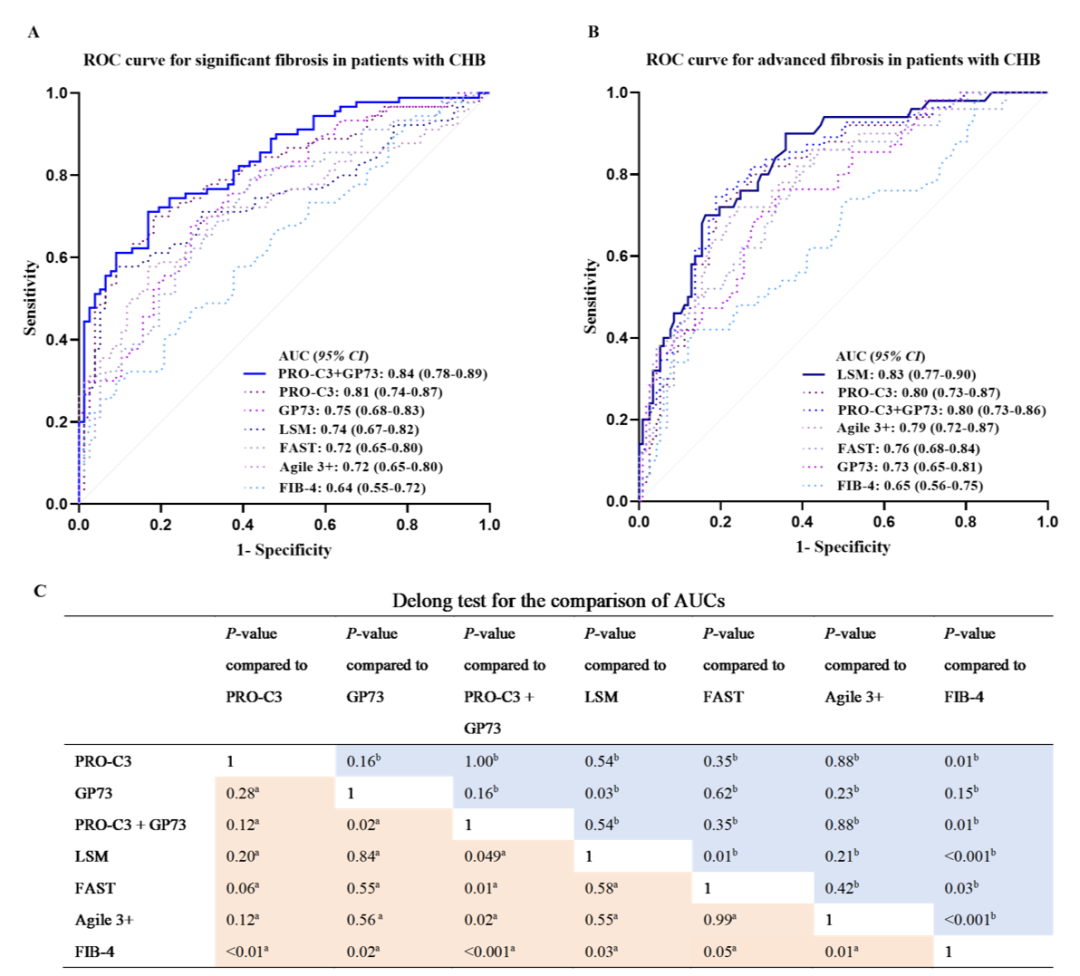 PRO-C3,尤其是與GP73聯(lián)合使用,是一種可用于識(shí)別CHB患者的肝纖維化的可靠的非侵入性檢測指標(biāo),其診斷準(zhǔn)確性優(yōu)于FIB-4、FAST、Agile 3+和LSM。這為監(jiān)測CHB患者的纖維化進(jìn)程和指導(dǎo)臨床決策提供了新的、具有成本效益的準(zhǔn)確選擇。
