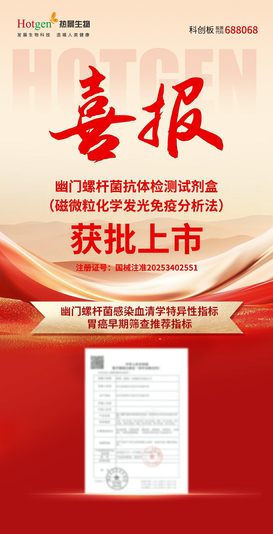 近期,北京熱景生物憑借深厚的研發(fā)積淀與技術(shù)創(chuàng)新實(shí)力,成功斬獲一項(xiàng)新的醫(yī)療器械注冊(cè)證——幽門螺桿菌抗體檢測(cè)試劑盒(磁微粒化學(xué)發(fā)光免疫分析法)正式通過國家藥品監(jiān)督管理局批準(zhǔn)!這是繼胃蛋白酶原Ⅰ(PGⅠ)、胃蛋白酶原Ⅱ(PG Ⅱ)和胃泌素17(G17)后的第四個(gè)胃功能檢測(cè)項(xiàng)目,豐富了熱景生物在胃病管理領(lǐng)域的產(chǎn)品矩陣,為臨床診療提供更精準(zhǔn)的解決方案,為胃癌早期篩查提供更全的有效依據(jù)。